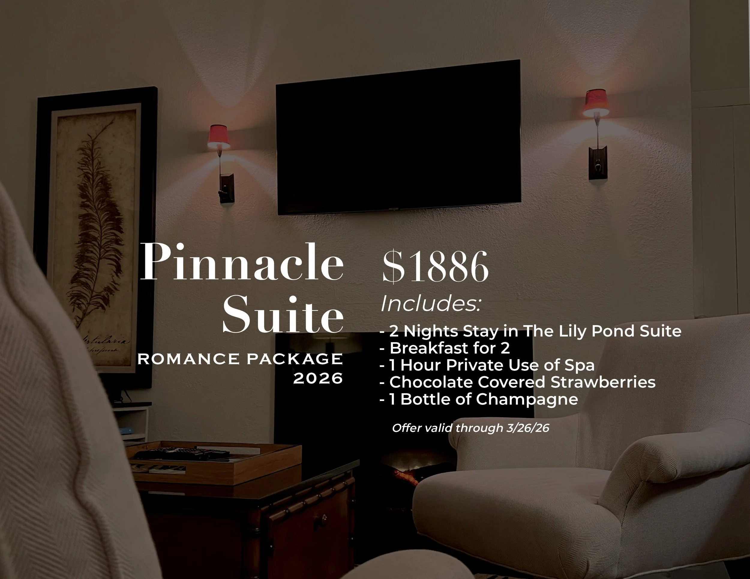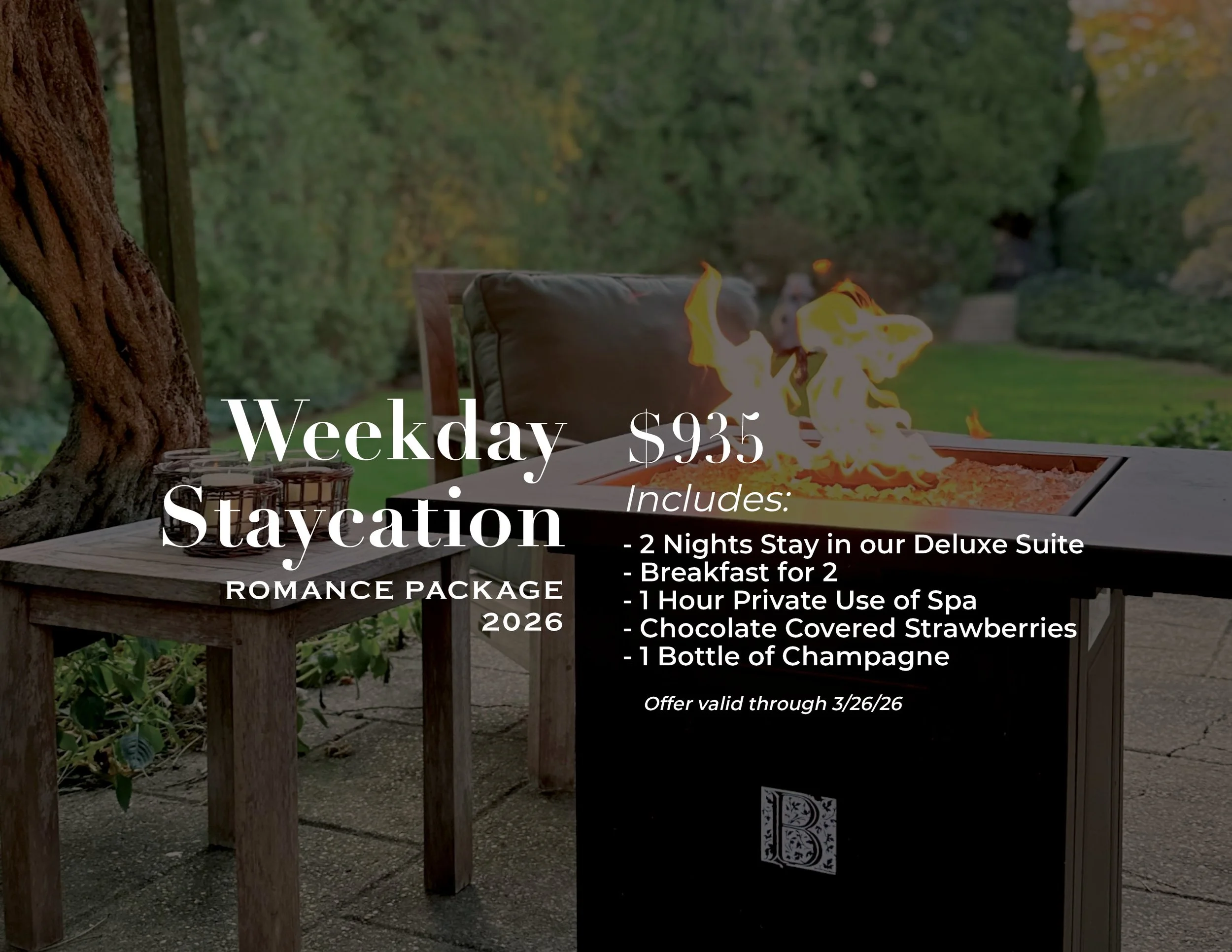 The ultimate getaway for two awaits. Share an intimate experience for two days in our luxury suite: The Lily Pond. Located in the Carriage House, this setting offers privacy and the ultimate serene escape with your own living room access with fireplace and a view of the property. included in this package is the offering of champagne and chocolate covered strawberries.