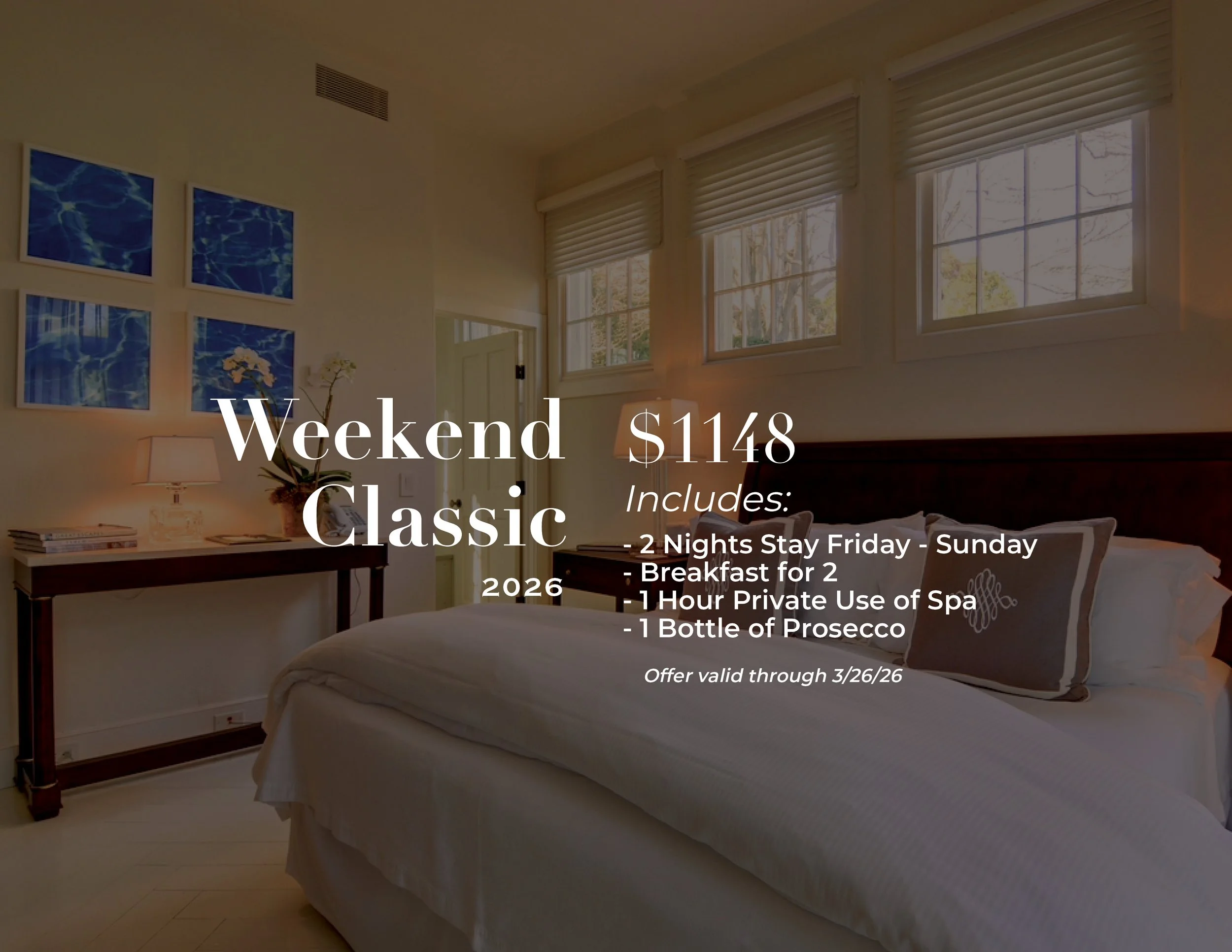 Enjoy 2 nights stay Friday through Sunday in our classic rooms for a weekend getaway or winter staycation. Available rooms include: The Georgica, The Huntting, The Dunemere and The Hedges. Enjoy breakfast between 8am and 11am overlooking the courtyard and book the spa for 60 minutes with up to 2 people. Explore local events, shops stay cozy on our Baker House grounds. $1148